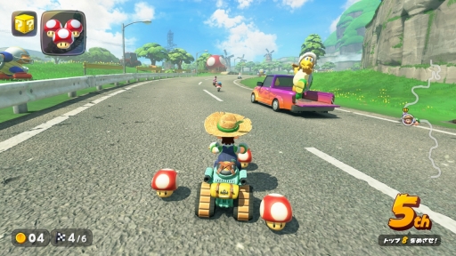 操作感は「マリオカート8 デラックス」と大きな違いはないが,まず驚かされたのは,レースが「ローリングスタート」だったこと。文字どおり,走行状態のままスタートする方式で,今作の世界がすべてつながっている構造と関係していそうだ。なお,トレイラーでも確認できるが,レースのルールや場面によっては従来どおりの「スタンディングスタート」もある。
