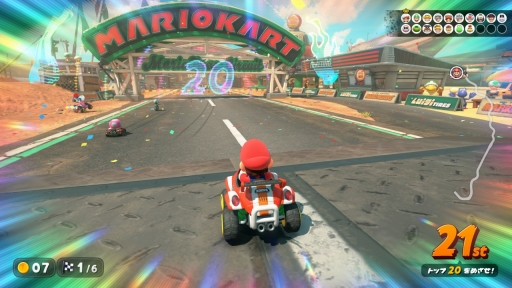 そして何より印象的だったのが,「台数が増えただけで,こんなにもレースが変わるのか!」という驚きだ。マシン同士の接触が劇的に増え,アイテムボックスの争奪戦も熾烈に。ちょっとの操作ミスが命取りになる一方で,うまく立ち回れば一気に集団をごぼう抜きできる場面なんかもある。混戦のなかでの判断力や駆け引きが試される展開は,とくにマルチプレイにおいて新たな“読み合い”を生み出しそうだと感じた。