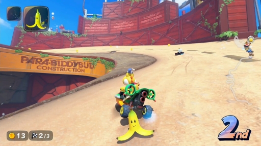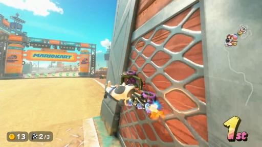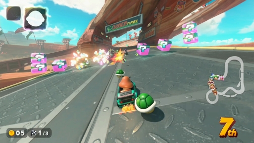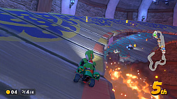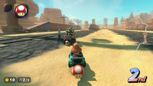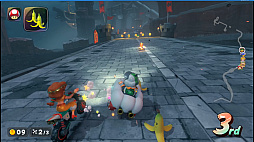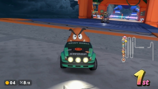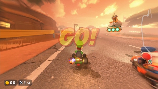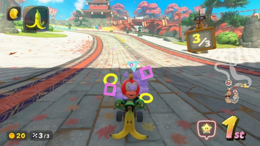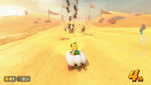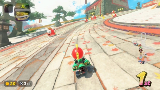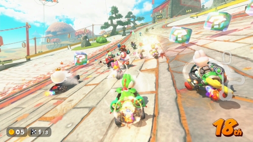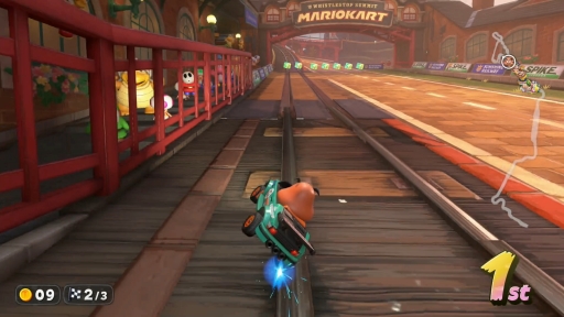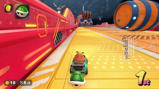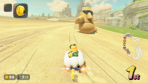 注目ポイントは尽きないが,最後に音楽やサウンドにも触れておきたい。レース中はコースの雰囲気が変わるとそれに合わせて音楽も変化するのだが,「このタルが転がってくるところ,あのゲームの音楽とSEじゃん!」みたいな,マリオカートシリーズはもちろんマリオのゲームが好きな人なら「ハッ!」となるようなアレンジ楽曲やサウンドが随所に散りばめられている。