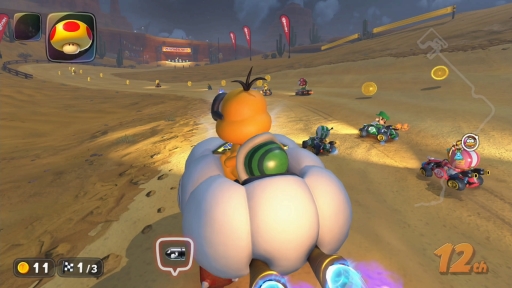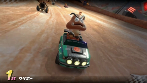 なお,息子とともに親子でクリボー推しの身としては,今回はひたすらにクリボーだった。マシンの動きにあわせて小刻みにプルプル震えたりつぶれたりする後頭部,かわいい。「やられちゃった!」って転んでいるトコ,心配だけどかわいい。「そもそもどうやってハンドル操作を?」ってところ,たまらない。