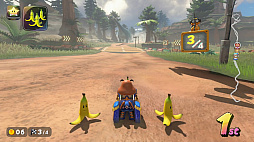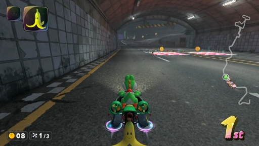 さて,24台が走り回る本作は,今までのマリオカートと比べ物にならないくらいほかのマシンとの接触が増え,多くのこうらやバナナが飛び交うレースになる。