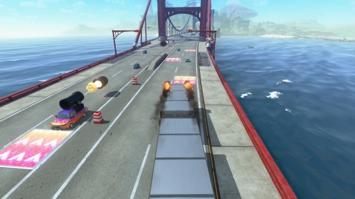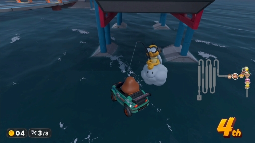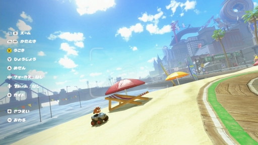 ガードレールを壊して進むみたいな,けっこうムチャができるのも楽しい。調子に乗ってぶんぶん飛ばしていると「あっ,あぶない!」と,あちこち歩いているキノピオやヨッシーといった街の住人にぶつかりそうになるけどだいじょうぶ。ぶつかっても「ぼよんぼよん」みたいに弾かれてピョンピョンするだけだ(でもなんか申し訳ないから,ぶつからないよう気付けないと……)。