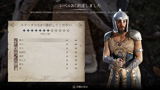 レベルアップ時には「徳」ポイントを獲得し,これを8つの基本能力値(筋力,知力,気力,敏捷性,速度,持久力,魅力,運)に自由に割り振れるため,能力値の成長が大幅に簡略化されている。