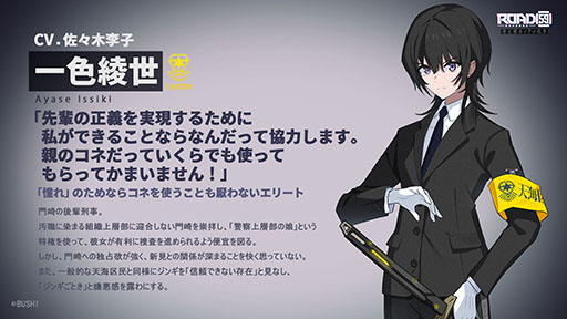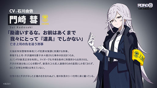 ビジュアルノベルゲーム「ROAD59 -新時代任侠特区- 摩天楼モノクロ抗争」に登場する新キャラクターのプロフィールとキャスト情報を公開しました。ROAD59ならではの一癖も二癖もあるキャラクター達のゲームストーリーでの活躍にぜひご期待ください!