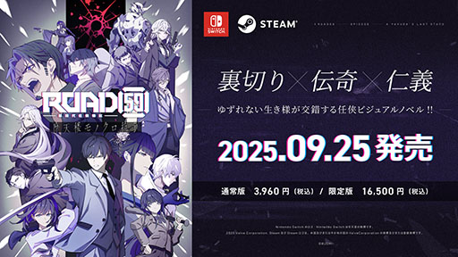 ブシロードは2025年9月25日発売のNintendo Switch、Steam向けビジュアルノベルゲーム「ROAD59 -新時代任侠特区- 摩天楼モノクロ抗争」のOP映像を公開しました。