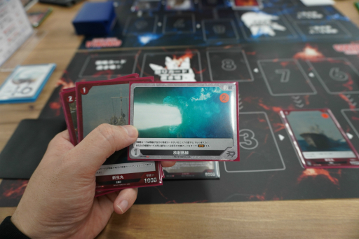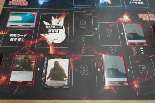 たとえば,8等級の交戦カードは極めて強力だが,相手のゴジラがエリア8に到達していなければ場に出せない。そこから1歩でも前に進まれたら敗北確定なので,かなりギリギリの状況でなければ使えないことになる。
