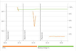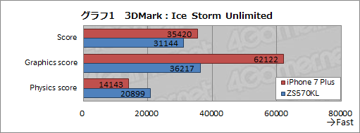 Snapdragon 820搭載機も30000前後ということからすると,iPhone 7 Plusのスコアは,現行のスマートフォンで最も高いといえる。とはいえ,スコアの大半はGraphic testで稼いだもので,しかも「Monitoring data」でグラフを見ると,フレームレートの値がやたらと高い状態で,本当に正しく計測できているのか,少し不安になるほどだ。その一方で,Physics testのスコアはZS570KLを大きく下回っていた。