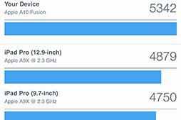 シングルコアでのCPU演算性能を測る「Single-Core Score」が「3353」,マルチコアでの演算性能を測る「Multi-Core Score」という結果だった「5342」。このスコアを,アプリ内で参照できる従来のiPhoneシリーズで計測されたものと比較してみると,iPhone 6s PlusのMulti-Core Scoreが「4030」で,iPhone 6 Plusは同じく「2472」とのこと。着実な性能向上を実現していることが分かった。
