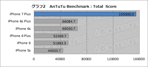 2015年9月に掲載したiPhone 6sおよびiPhone 6s Plusのレビュー記事に,AnTuTu Benchmarkで計測したiPhoneシリーズでのスコアが掲載されていたので,iPhone 7 Plusのスコアとまとめたグラフ2を作成してみた。OSやアプリのバージョンが異なるので,あくまでも参考レベルになるが,iPhone 7 Plusの性能向上ぶりがよく分かると思う。
