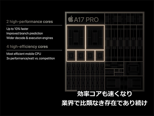 高性能コアの性能が従来比で10%向上した。気になるのは,命名規則が変わったのか「A17 Bionic」ではなく,A17 Proとなった点。もしかするといずれA17 Bionicが登場するのかもしれない。