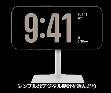 ディスプレイのスペックや機能は,iPhone 14 ProやiPhone 14 Pro Maxと共通しており,常に画面を表示しておく常時点灯機能「Always on Display」もそのまま利用できる。さらにiPhone 15 ProやiPhone 15 Pro Maxには,「スタンバイ」機能が加わった。iPhoneを横向きで充電するときに,時計や予定などを表示する。