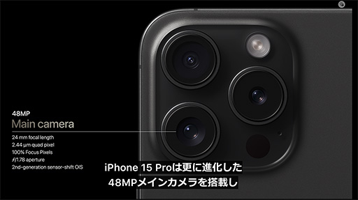 iPhone 15 ProやiPhone 15 Pro Maxでは,もちろんカメラ機能も強化されている。アウトカメラは,標準と広角,望遠の3眼構成といった点は,従来製品と変わらないが,標準カメラに組み合わせる撮像センサーのサイズが大きくなった。写真の高画質化技術「Photonic Engine」を活用することで,1つの標準カメラで24mm(35mm換算,以下同),28mm,35mmという3種類の焦点距離で撮影できるそうだ。