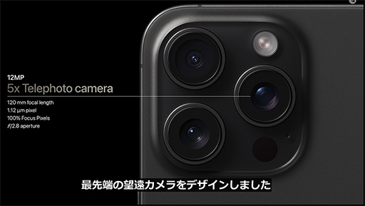 また,iPhone 15 Proは,光学3倍の望遠カメラを搭載するのに対して,iPhone 15 Pro Maxは光学5倍で,最大120mmの焦点距離を撮影できる。