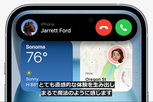 iPhone 15とiPhone 15 Plusは,iPhone 14 ProやiPhone 14 Pro Maxに搭載していたスペックや機能を「無印版」に落とし込んだ製品となる。たとえば,ディスプレイでは,フロントカメラ周辺に,アプリや動作状況に応じて形を変える通知領域「Dynamic Island」を表示できるようになったのに加えて,最大輝度が従来の1000cd/m