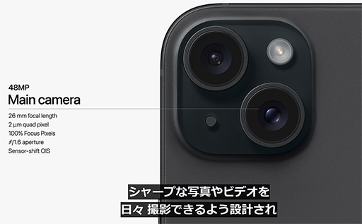 また,iPhone 15とiPhone 15 Plusでも,コネクタがUSB Type-Cとなった。ただし,こちらはUSB 2.0に準拠した最大480Mb/sでのデータ転送とのことで,大容量のファイルをやり取りするのには向かない点には注意が必要だ。