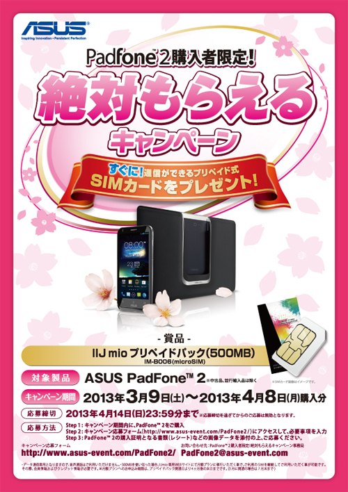 ASUSの「PadFone 2」購入でデータ通信SIMをもらえるキャンペーンが始まる