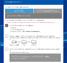 PCからPlayStation.comの「PlayStation 4システムソフトウェア アップデート」ページへアクセスし,まず「アップデート方法」から「パソコン経由でのアップデート」を選択。その後遷移先で「アップデート(システムソフトウェアを再インストール) 本体のハードディスク交換/初期化の際の再インストール方法はこちら」をクリックすると,(2)のところに,