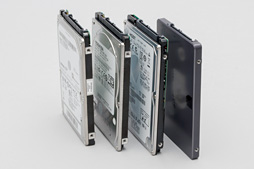 ![]() 9.5mm厚の大容量HDD代表として用意したTravelStar 5K1500-1500。回転数は5400rpmで,バッファ容量は32MBとなっている |