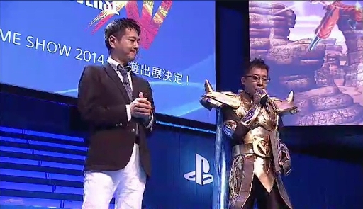 バンダイナムコゲームス ディビジョンマネージャー 内山大輔氏が登壇。さらに「月刊Vジャンプ」編集長の伊能昭夫氏も聖衣風(?)の衣装を身につけて登壇しました。