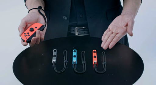 Joy-Conの解説映像に入りました。Joy-Conは蛍光色の赤,青が用意されるようです。専用のストラップもあり。