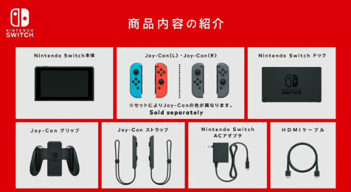 Nintendo Switchに含まれるのは,Nintendo Switch本体,Joy-Con(L)/(R),Joy-Conストラップ×2,Joy-Conグリップ,Nintendo Switch ドック,HDMIケーブル,専用ACアダプター。