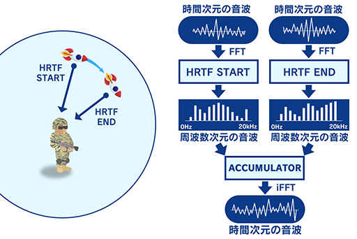 まず,素材となる音は,高速フーリエ変換(FFT)によって周波数領域に変換される。音源が速度を持って動いている場合,移動元の「HRTF START」(移動元の始点座標におけるHRTF)と移動先の「HRTF END」(移動先の終点座標におけるHRTF)をHRTFデータベースから取り出して,素材の音をHRTF STARTとHRTF ENDでそれぞれ変調する。変調後の音は,仮に始点音,終点音と呼ぼう。