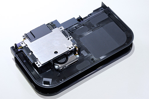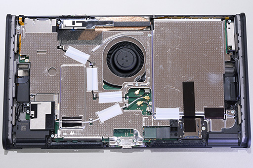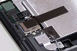 シールド板は放熱板もかねているようで,背面パネル側にも熱を拡散できるよう,一部に熱伝導率に優れたグラファイトのシートが貼り付けられていた。