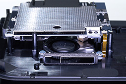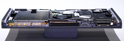 背面のカバーパネルを外すと,内部は金属のシールド板で広く覆われていた。中央やや上寄りには,冷却用のシロッコファンが見える。