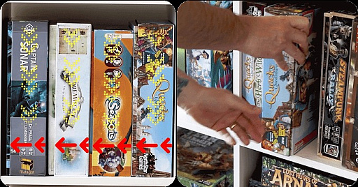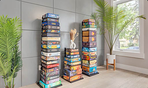 たくさんのボードゲームを持っている人にとって嬉しいのが,GamePillar Storage Towersだろう。ボードゲームを保管するには「本棚に縦置きする」か「横置きで平積みする」といった方法を取る人が多いと思うが,本棚に置くとボックスが自然に開いてしまうし,中身も偏る。平積みの場合,真ん中あたりに置いたゲームを取り出すのは一苦労だし,途中で,積み上げたゲームが崩れてしまったりする。