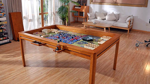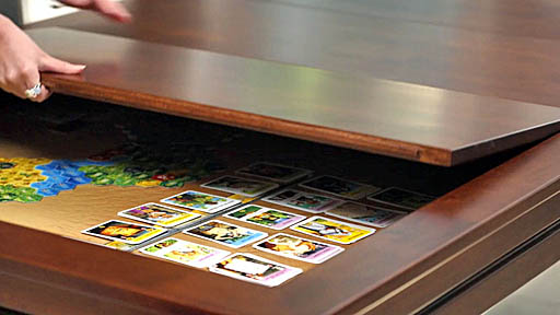 ボードゲーマーなら,ゲームスペースの周囲が高さ8cmのフチで囲われているところに反応しそうだ。普通のテーブルでボードゲームやカードゲームを遊ぶと,ダイスやカードが転がり落ちやすい。だが,このテーブルならフチが壁の役割をするためにゲーム用品が落ちにくいし,天板をはめ込めばただのテーブルに早変わり。食事などのためにゲームを一時中断したければ,天板をはめるだけで,Kickstarterのキャンペーンページによれば,10秒で切り替えられるという。