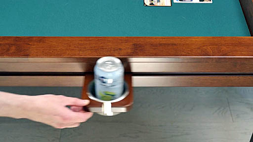 休憩が終われば天板を外し,ゲームの続きを楽しもう。サイド部分にはレールがあり,ドリンクホルダーやサブテーブル,栓抜きなどのアクセサリをセットできる。