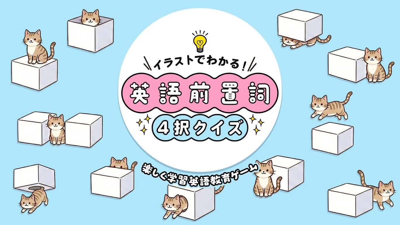 イラストをヒントに、英語の前置詞を4択で楽しく学べるクイズゲームです!