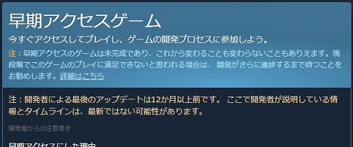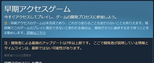 この警告文表示は,そんな早期アクセスゲームの中でも,長期間アップデートが行われていないものが対象となっている。