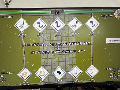 ポーカー要素は,武装の選択にある。かまぼこ,れんこん,だてまきなど,おせち料理をモチーフにしたさまざまな武装は手元に5つまで残せる。武装は単独で使えるもの,ペアで使用可能になるもの,スリーカードで使用可能になるものがあり,同時に条件を達成していれば複数の武装を使うことも可能だ。