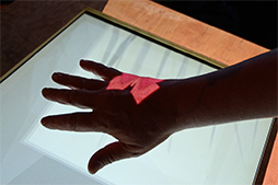 | ディスプレイ上に手を伸ばすと,そこに蝶が止まる。蝶が羽ばたくと,AIREALにより,その羽ばたきの風圧が感じられる,というデモ | |