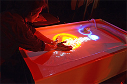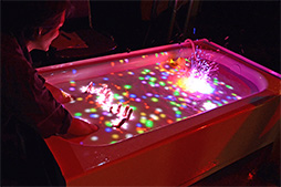 デモを見ていると,水面が波立っていないときはたしかに,白いプラスチックの板に映像を投影しているように見える。ところが,その映像に触れると指が水中に入ってしまうものだから,最初触れたときは何が起きているのかとっさに理解できず,非常に驚く来場者も大勢いたらしい。
