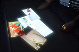 もう1つは,PCのデスクトップをイメージしたインタフェースのデモだ。このデモでは,動かしたいアイテムの下に手を入れ,水中から指を突き出すとそのアイテムを動かしたり,サイズを変えたりできるようになっていた。また,ファイルのコピー操作なら,両手でアイテムを水ごとすくい上げて,目的の場所にバシャっと落とすことで行え,ファイルの削除はアイテムを指で選択して,そのまま水面下に沈めると削除されるといった具合だ。