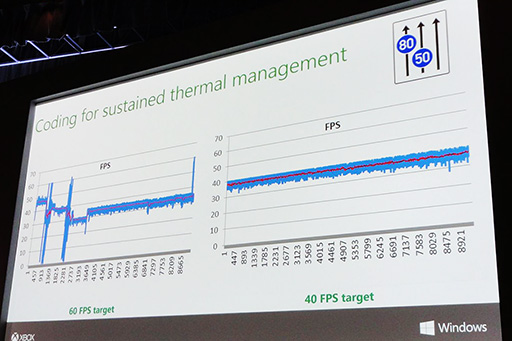 それに対して,40fpsを目標に作成されたゲームは,消費電力が抑えられるため安定したフレームレートが維持できている,というわけだ。