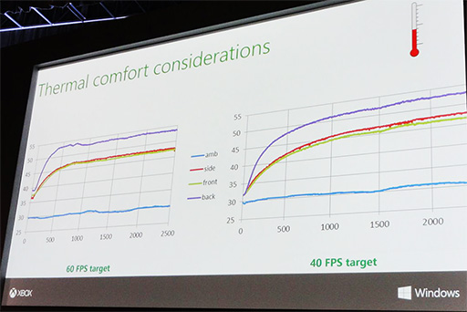 フレームレートを抑えたゲームは,温度の上がり方も緩やかになるという。次のスライドはスマートフォンの前面(front)と背面(back),両側面(side),そして環境温度(amb)の変化を記録したものだ。Calinov氏はグラフを示しながら,フレームレートを40fpsに抑えたゲームのほうが,温度上昇がゆるやかであると,その違いを説明した。