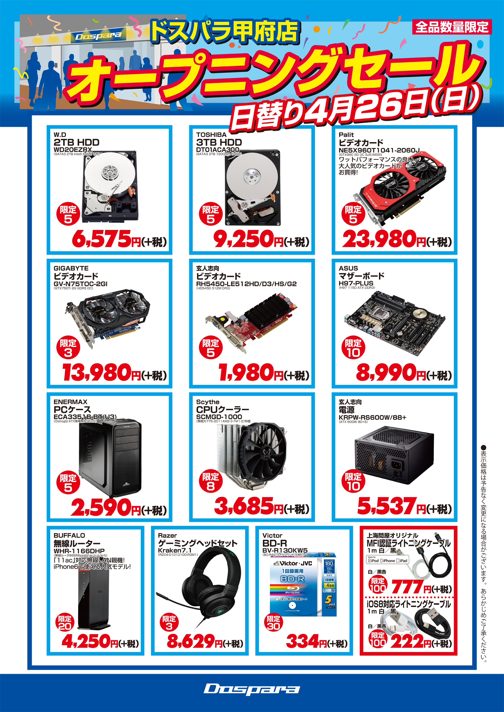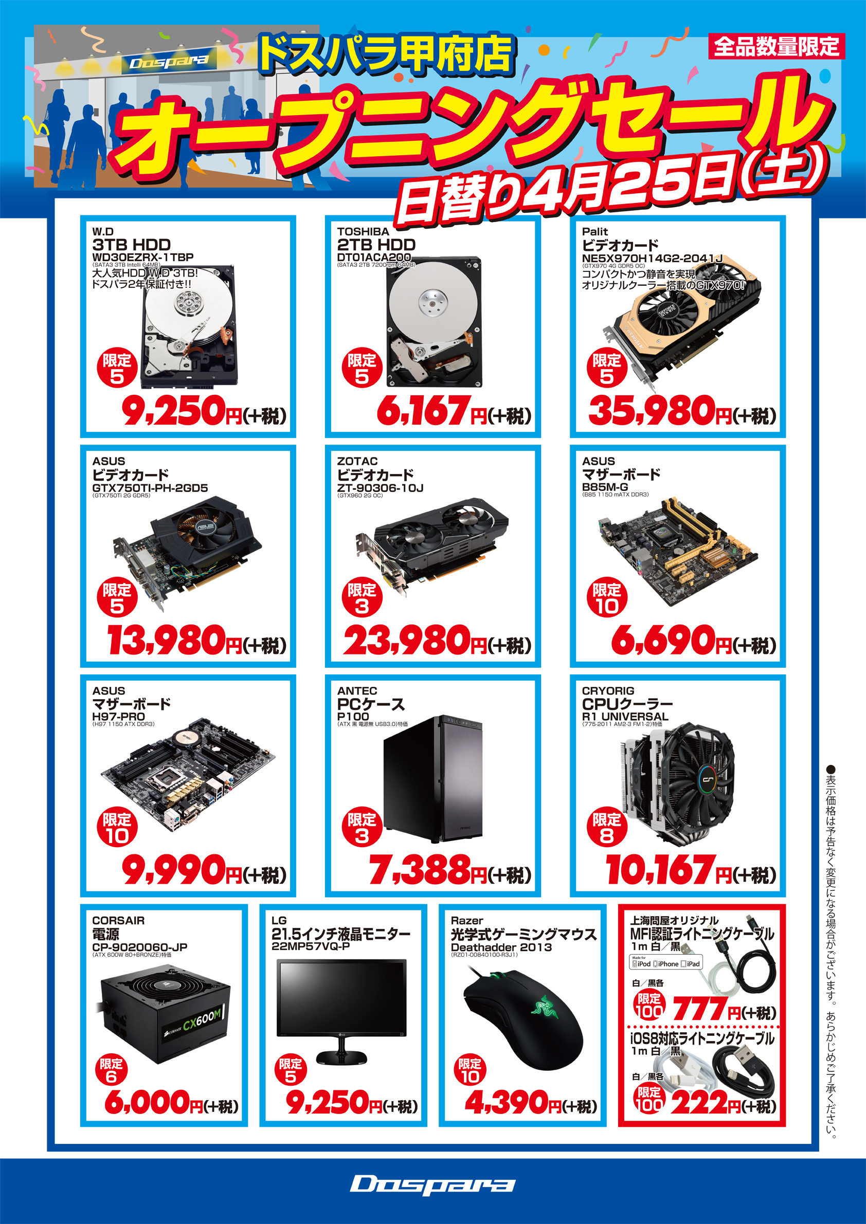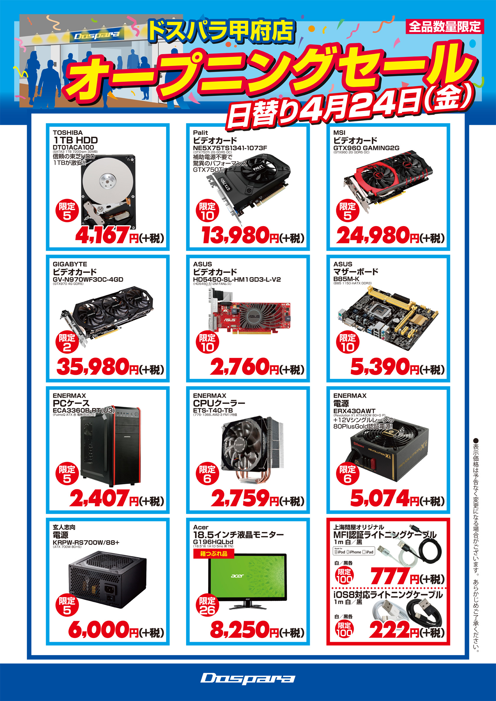 ドスパラ,山梨県甲府市に4月24日オープンの新店で記念セールを実施