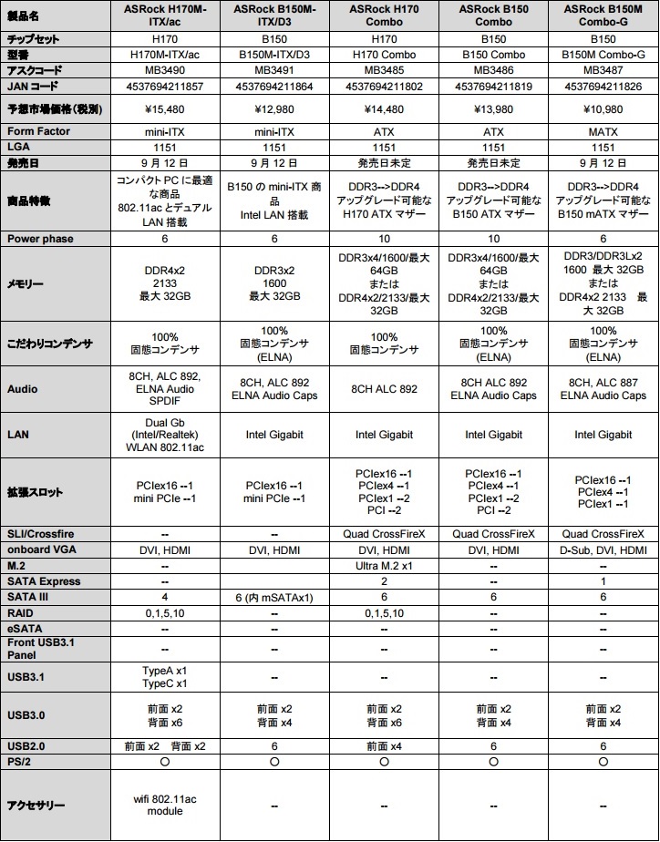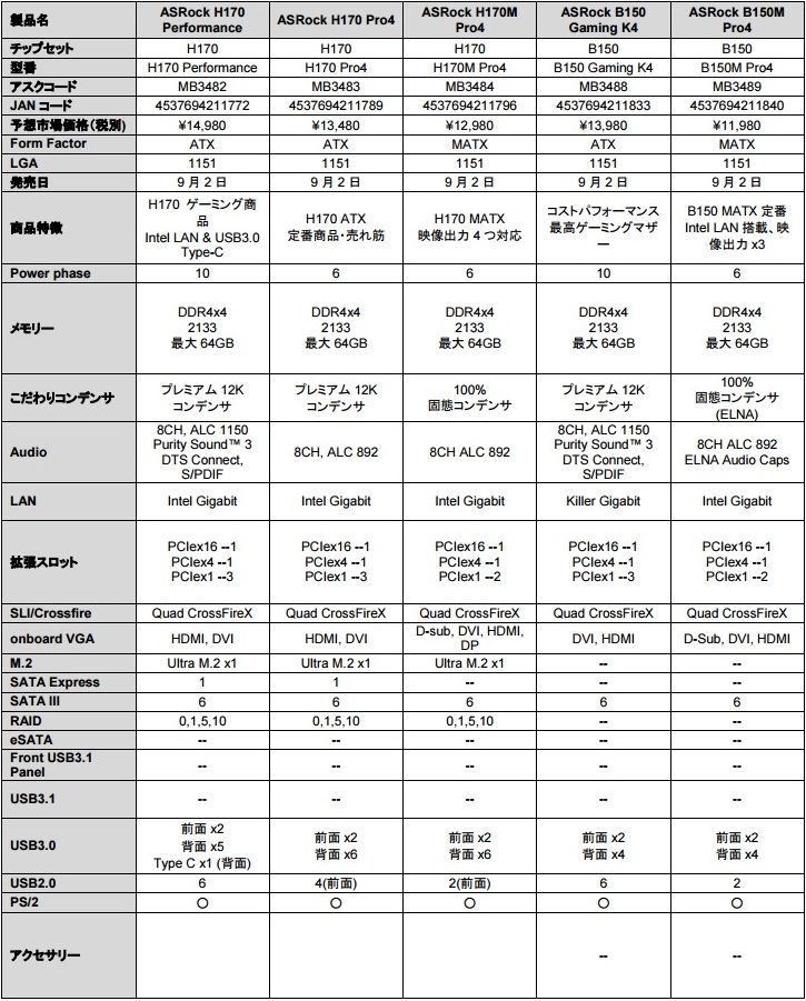 H170およびB150チップセット搭載のASRock製ゲーマー向けマザーが発売