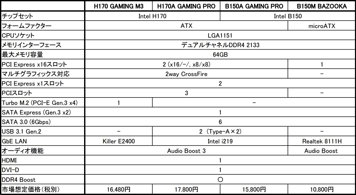 MSI,H170およびB150チップセット搭載のゲーマー向けマザーを国内発売