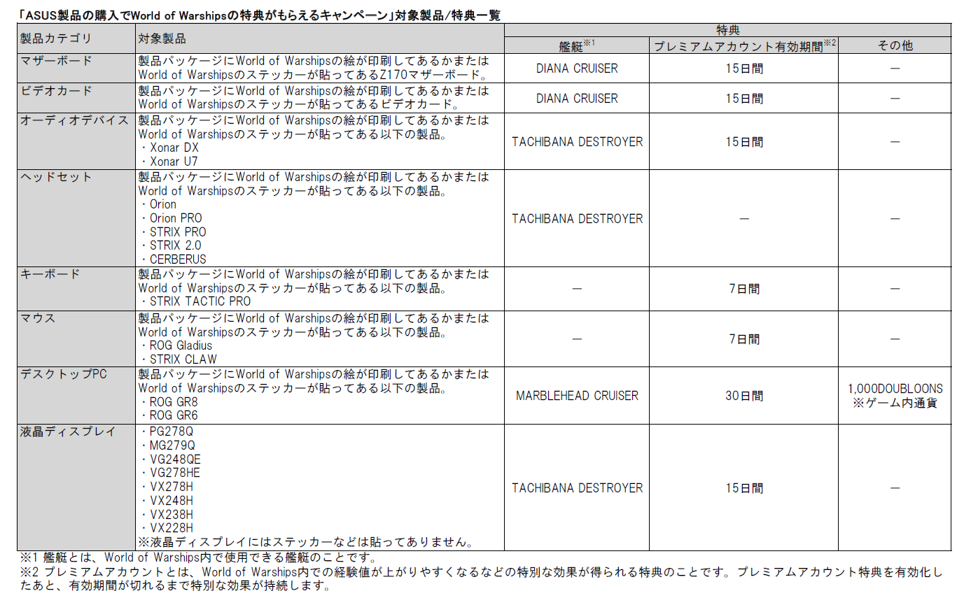 ASUSの対象製品購入でWoWsの艦艇や特典がもらえるキャンペーン,開催中