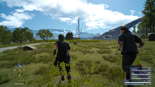 さて,Real-Time Live!で公開されたシーンは,主人公ノクティスとその仲間たちが,湖近くの草原を探索している場面からスタートする。まずは,主人公たちの歩きや走りのアニメーションに注目してほしい。