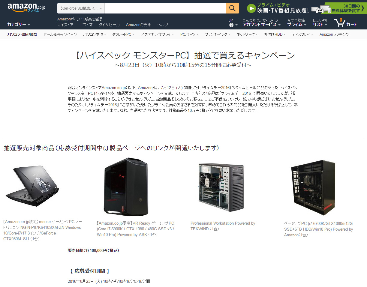 Amazon.co.jp,ゲームPC&デバイスのストアをリニューアルオープン。プライムデーで販売未成立だったゲームPCの抽選販売も予告