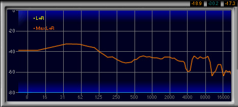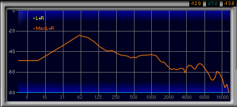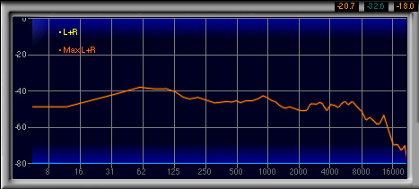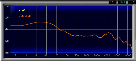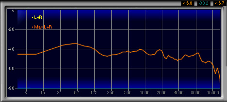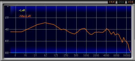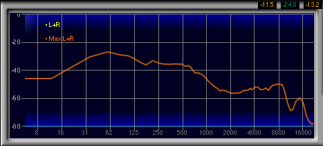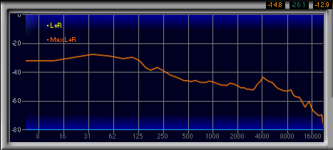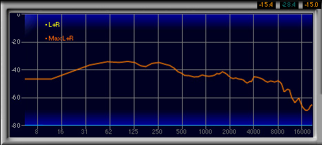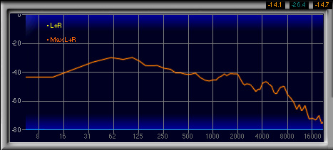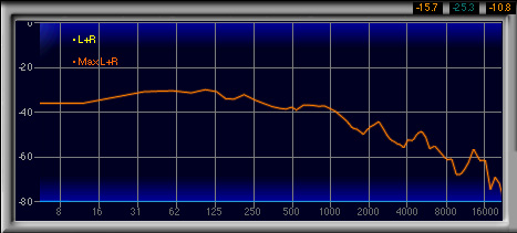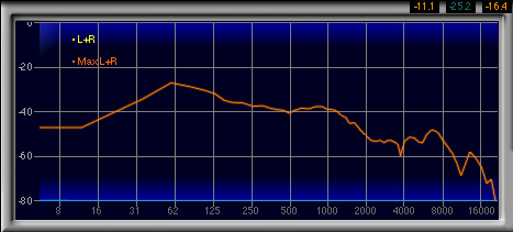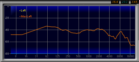 600Hz〜1.3kHzあたりがやや強く,2番目に高い山になっているのも見てとれるが,強い低域によってマスクされるためか,この帯域が相対的に強いとは感じなかった。