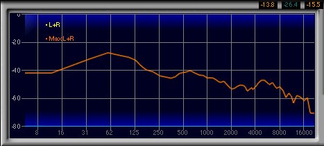 一方,1〜3kHzのプレゼンス帯域は(ロールオフする)16kHz以上を除けば最も低い。高域は8kHz以上で落ち込み始め,16kHzくらいから急峻に落ち込む。