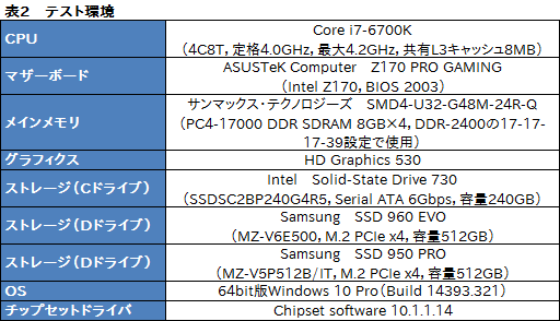 テスト環境は表2のとおり。基本的にはSSD 960 PROのレビューに使った環境と同じだ。比較対象にはSSD 950 PROの容量512GBモデルを用意した。本来であれば,同容量のSSD 960 PROを用意したかったところだが,今回は試用機材を入手できなかったため,見送った次第だ。