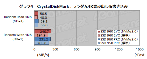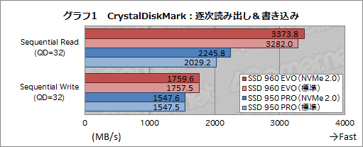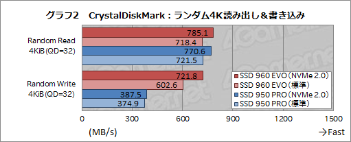 グラフ1は,逐次読み出しと逐次書き込みの結果をまとめたものだ。Samsungによる公称スペックでは,SSD 960 EVO(500GBモデル)の逐次読み出しは最大3200MB/s,逐次書き込みは1800MB/sとなっていたが,CrystalDiskMarkの結果は,逐次読み出しテスト「Sequential Read」は公称値をやや上回り,逐次書き込みテスト「Sequential Write」もわずかに下回る程度という優秀な結果となった。とくに逐次読み出しは,前世代のハイエンドモデルであるSSD 950 PROよりも,1000MB/s以上速い。