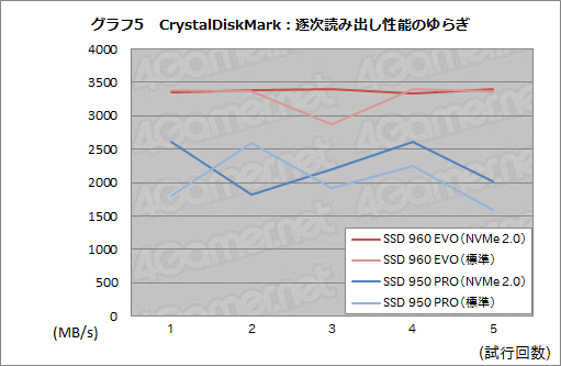 最後に,QD=32設定時における逐次読み出しテスト計5回分のスコアをまとめて折れ線グラフにしてみた(グラフ5)。
